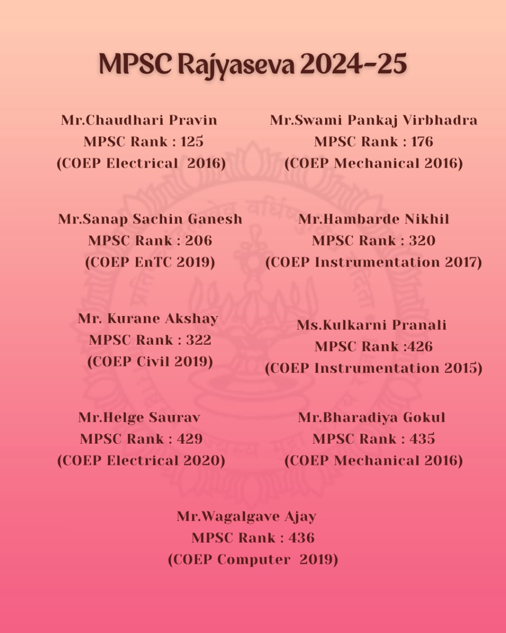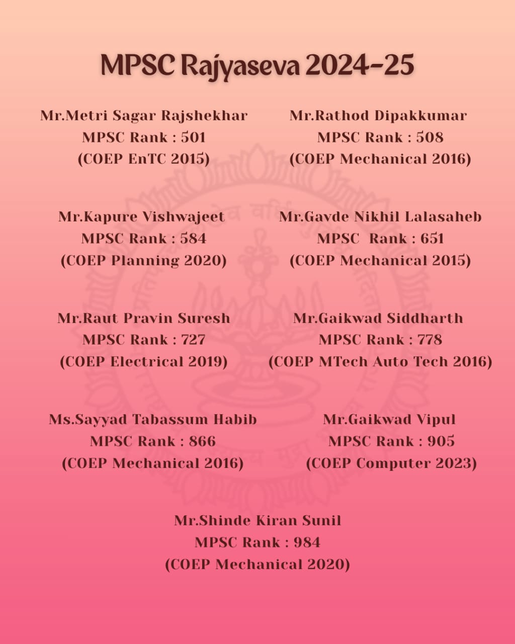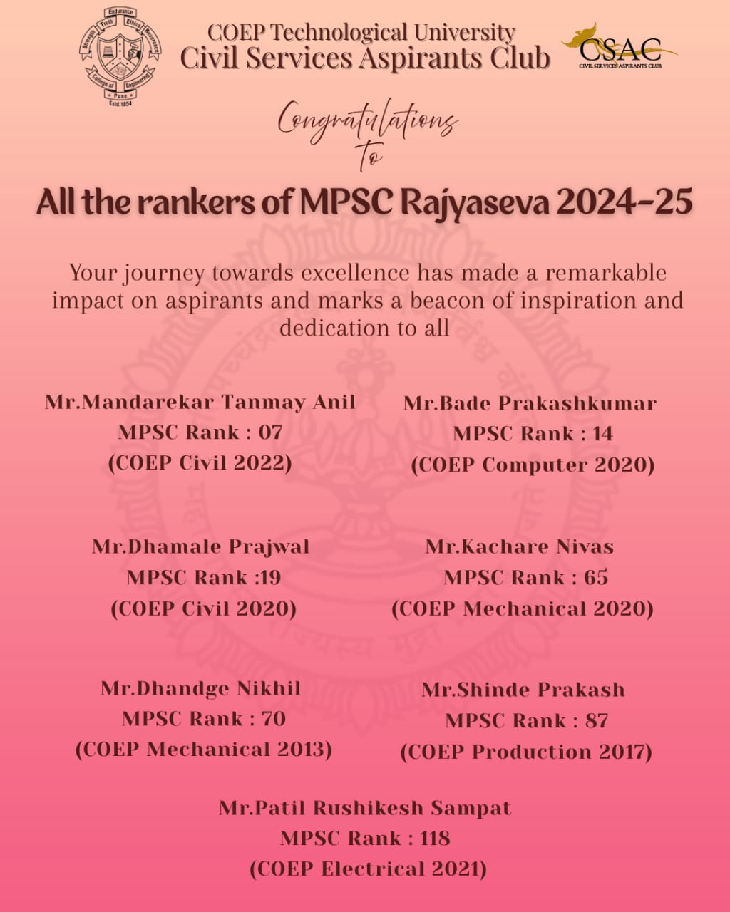 We are immensely proud to share that 29+ COEPians have made it to the final list of the MPSC Rajyaseva Exam 2024-25! π